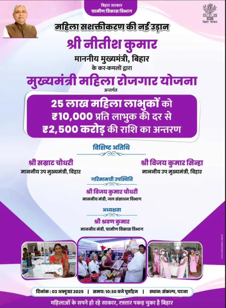 बिहार सरकार द्वारा महिलाओं को आत्मनिर्भर बनाने के लिए चलाई जा रही मुख्यमंत्री महिला रोजगार योजना के तहत अब एक और बड़ी खुशखबरी आई है। अगर आपने भी इस योजना में आवेदन किया था और अभी तक पैसा आपके खाते में नहीं आया था, तो अब आपके लिए सुनहरा मौका है। क्योंकि Bihar Mahila Rojgar Yojana 2nd Installment 2025 Release के तहत 25 लाख नई महिलाओं को 10-10 हजार रुपये की दूसरी किस्त भेज दी गई है।